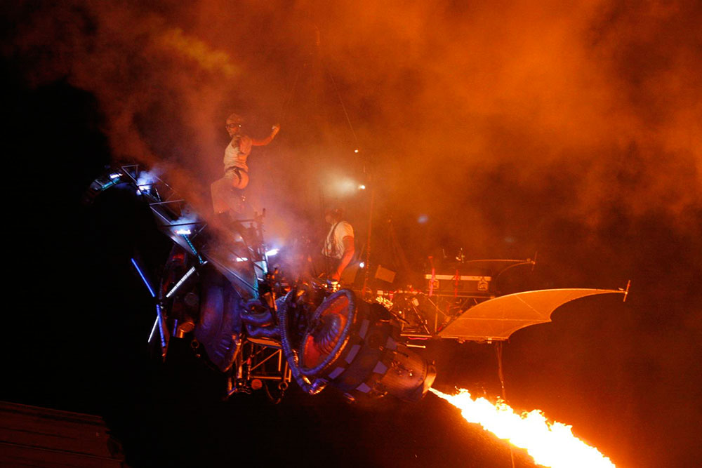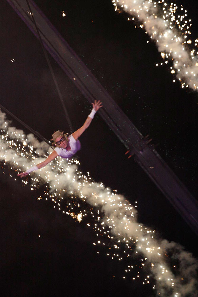 The bulk of the show takes place high in the air suspended from an industrial crane with the various acts flown on and off stage. The only staging required is three large shipping containers to hide the jet and provide a performance space. This creates terrific sight lines and ties up less valuable real estate on the ground. This arrangement also creates a truly unique and spectacular show unlike anything ever seen before!