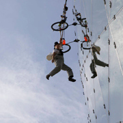 Our show started with a brand new act that we created just for this event entitled The Window Washer. This was an act created by our very talented in house stunt clown, Jonah Logan. The show started as our window washer character made his way down the glass facade on a series of ropes with his humourous window washer cart. He then performed numerous physical gags outside on the vertical glass surface and interacted with his audience inside the building. He was able to communicate by writing words in spray foam washing fluid and was a perfect gentleman tipping his hat to the ladies. At times it appeared like he was going to fall off his cart as he dangled from the rig by one arm but is was all part of the hilarious choreography in this truly unique warm up act.